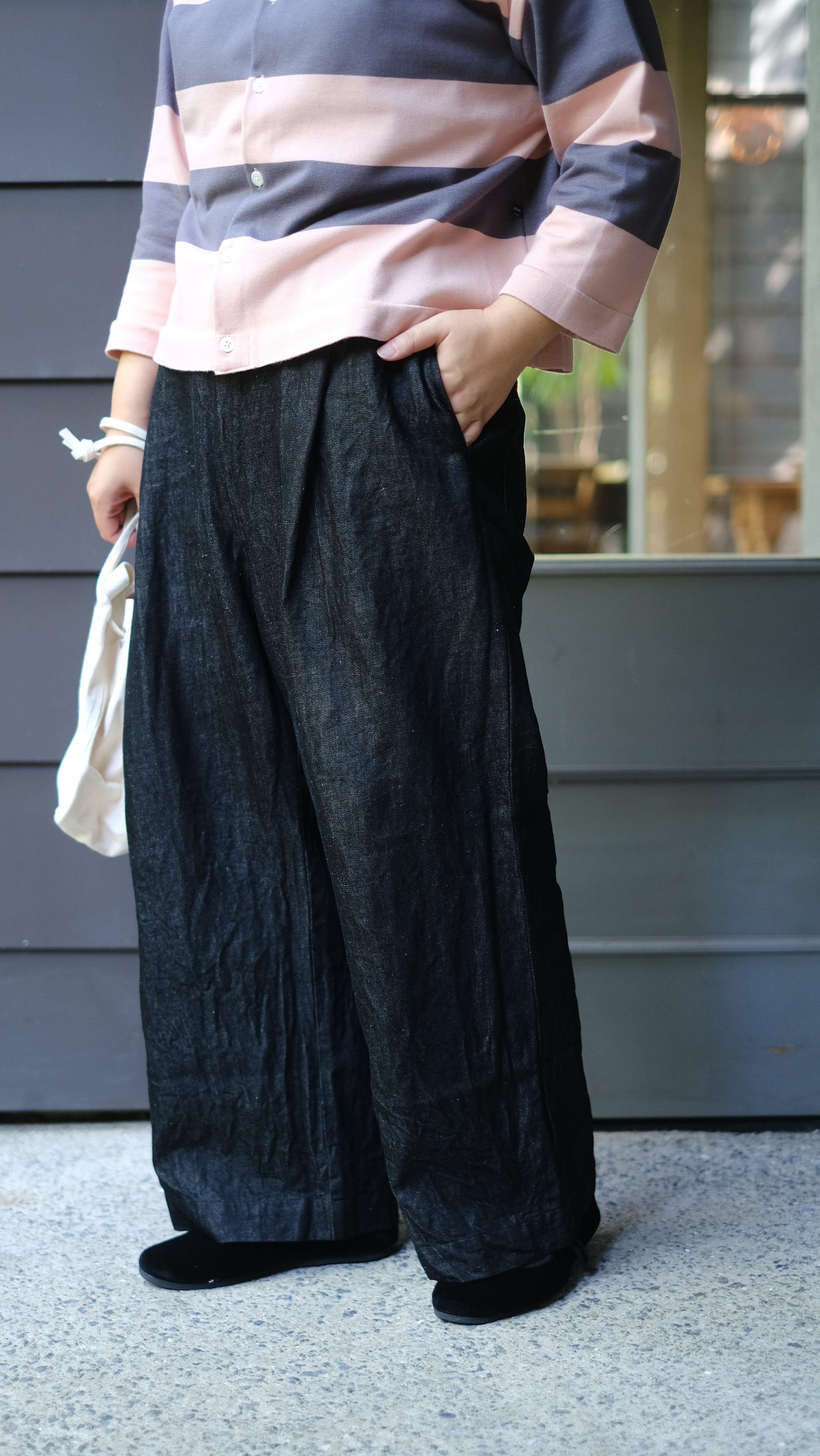 ヒップまわりにゆとりのあるワイドパンツ。